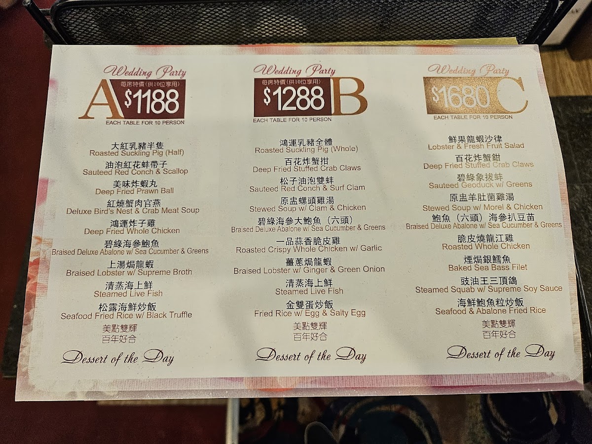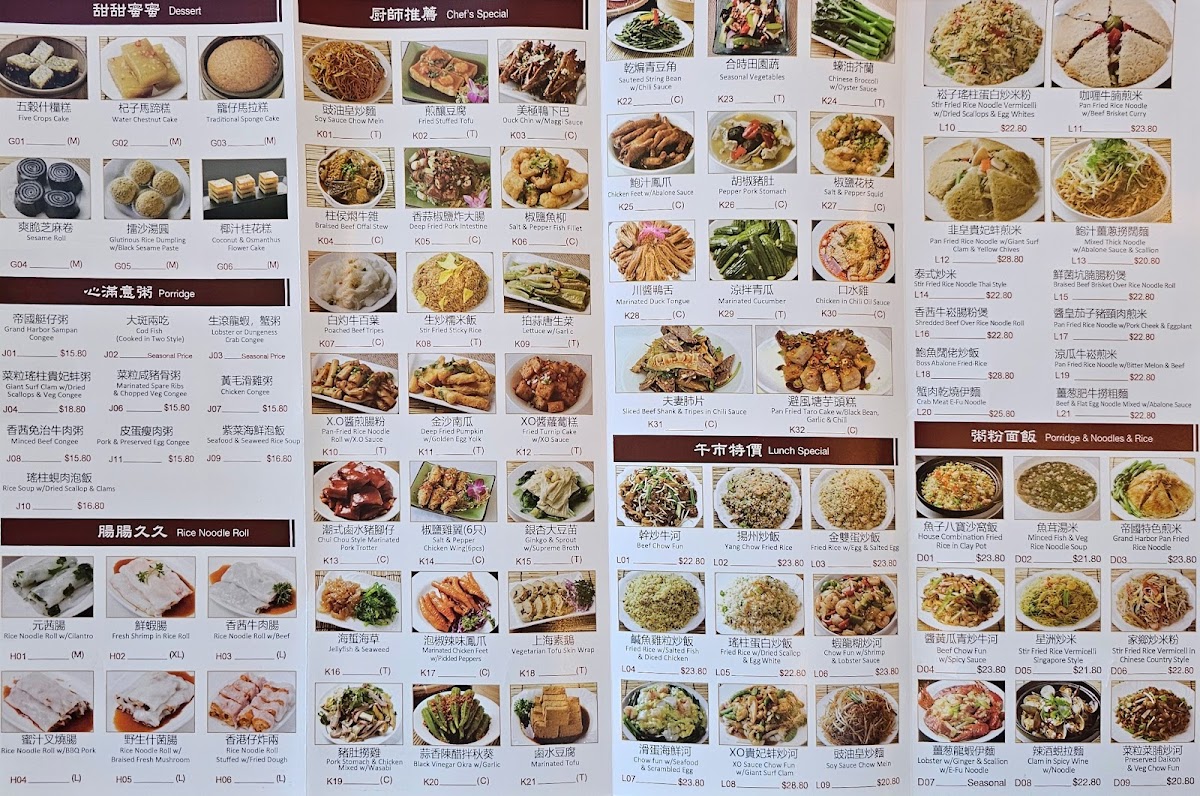 The menu at Grand Harbor Seafood and Dimsum Restaurant offers a variety of Cantonese and dim sum dishes organized into distinct categories for ease of selection. Guests can choose from a range of steamed, pan-fried, and deep-fried dim sum items, including traditional dumplings, buns, and specialty rolls. The steamed section features items such as shrimp dumplings, shiu mai with albacore or shrimp roe, chicken feet with mixed sauce, and sticky rice wrapped in lotus leaf.